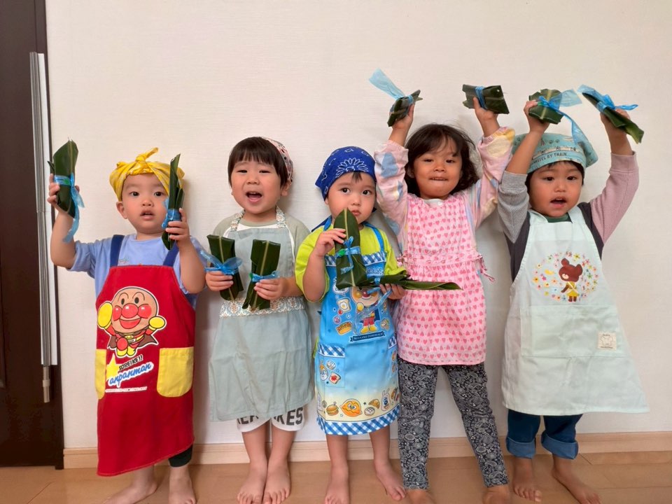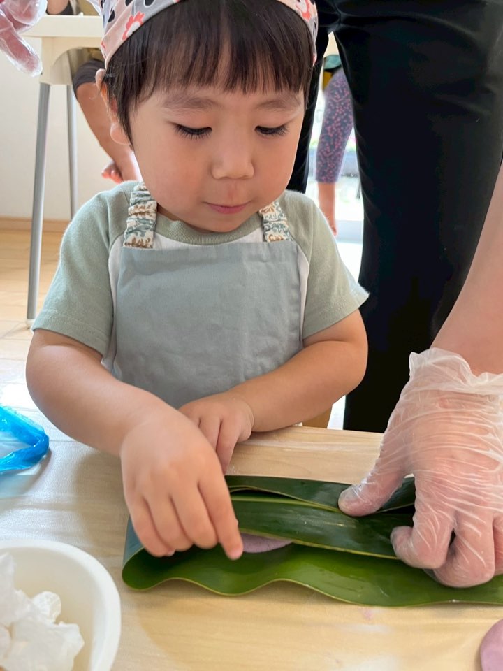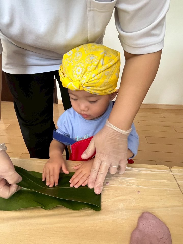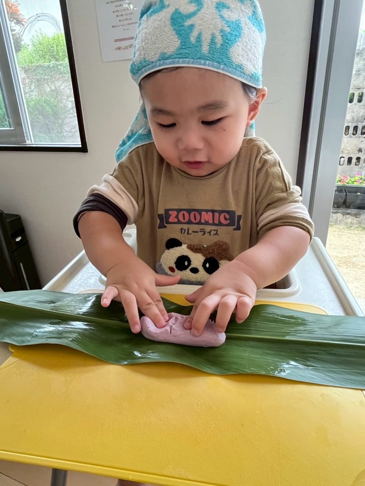 今日はいちご組(1歳児)、ぶどう組(2歳児)でムーチーづくりをしました!